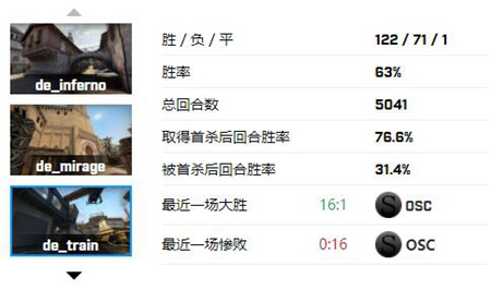 de_train地图:122胜71负1平 胜率高达63% 总回合数5041场