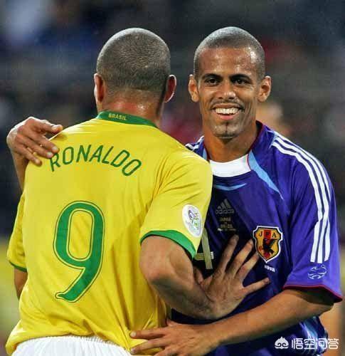 法国世界杯上,代表日本队出战的巴西人三都主拥抱大罗(上图)