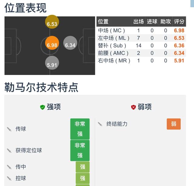 目前来讲,勒马尔的现状应该是这六位天才新人中处境最差的一位了,目前马竞俱乐部也快要对他失去了耐心,很有可能将其出售,不知道本赛季勒马尔能否在找回一些状态,希望他能在留在马竞一个赛季证明自己。