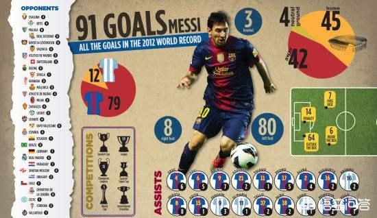 2012年整个自然年梅西俱乐部和国家队打进91球,打破了盖德穆勒尘封40年的85球记录,其中为巴萨出战60场打进79球,国家队出战9场打进12球,场均1.3球。2011-12赛季梅西共计为巴萨打进73球,其中联赛50球,杯赛23球,同样是打破的盖德穆勒的记录,72-73赛季盖德穆勒为拜仁打进67球,其中联赛36球,杯赛31球。2008-2009赛季巴萨历史性斩获6冠王,梅西6项锦标皆有进球+助攻,另有西甲历史射手王等等记录不再一一列举。