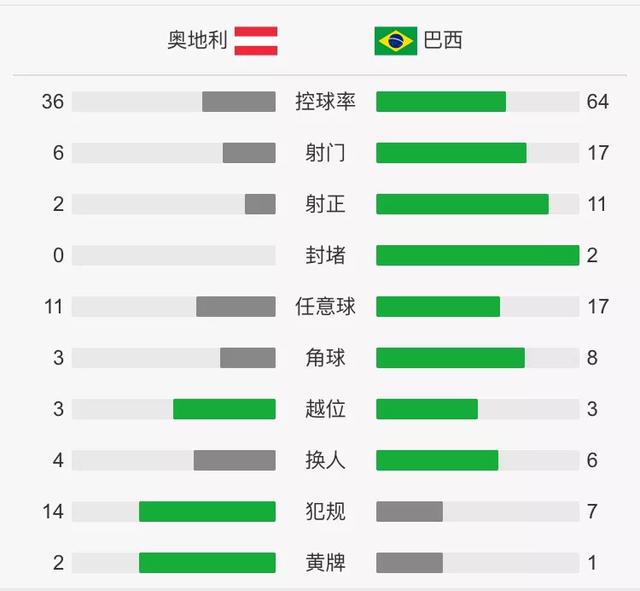 内马尔连续两场比赛取得了进球,他的状态看样子非常不错,这对于巴西征战世界杯是一个利好。伤缺很久的内马尔伤愈归来仍是王者。本场比赛,首发前锋热苏斯,库蒂尼奥等球员表现的都很不错。他们占据了场上绝大多数控球时间,数据也占据绝对优势。即便奥地利上一场比赛战胜德国,但今晚的比赛,面对态度积极的巴西队,他们不得不面对输球的现实。
