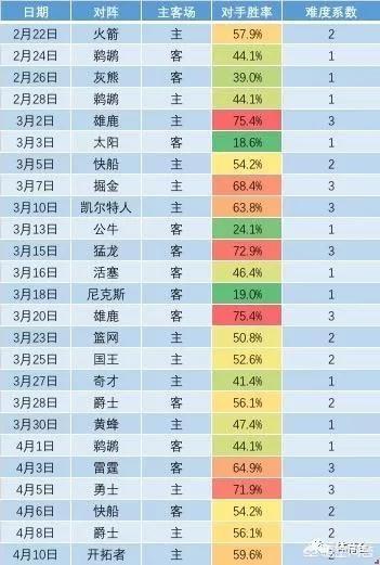湖人剩余比赛中有13个主场,然而对手平均胜率高达57.2%,不乏东西部排名第一的雄鹿和勇士。以湖人一贯遇强不弱的风格,主场取胜问题并不大。